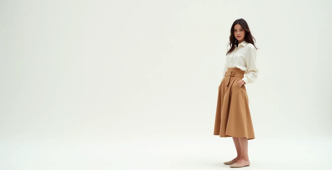 Olvídate de acumular « prendas para bajitas ». La clave para alargar tu figura sin necesidad de tacones es aprender a componer tu propia silueta como si fueras una artista. Se trata de entender dónde colocar las líneas de corte, cómo equilibrar los volúmenes y cómo guiar la mirada de los demás para crear una ilusión óptica de verticalidad. Es transformar tu cuerpo en un lienzo y tus prendas en las herramientas para esculpirlo. Este método no falla porque no se basa en modas pasajeras, sino en la forma en que el cerebro humano interpreta las formas y las proporciones.