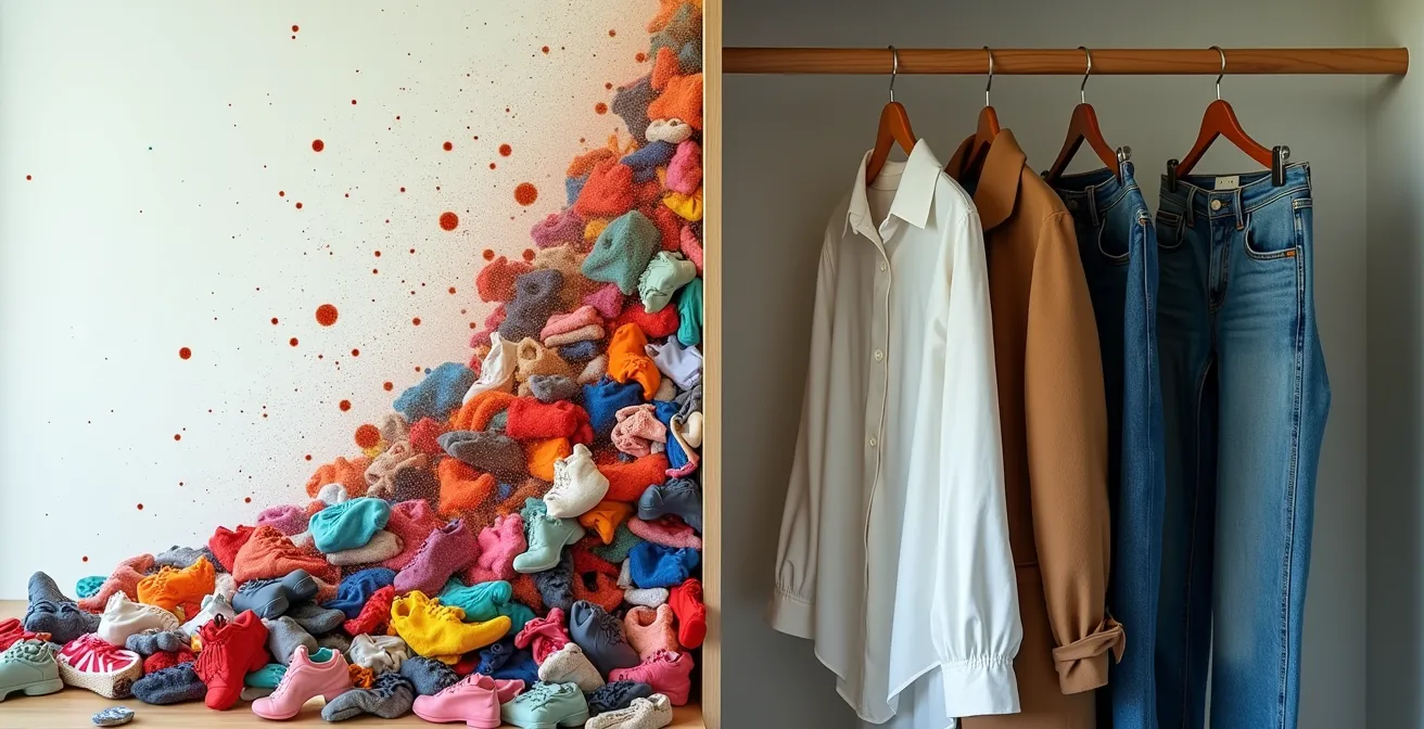 El atractivo del « fast fashion » es obvio: precios bajos y acceso instantáneo a las últimas tendencias. Sin embargo, este modelo esconde un coste económico devastador a largo plazo que no se refleja en la etiqueta. Como analistas de nuestro propio armario, debemos introducir una métrica clave: el Coste Real por Uso (CPU). Esta sencilla fórmula (Precio de la prenda / Número de veces que la usas) revela la verdadera naturaleza de una « ganga ». Una camiseta de 20€ que solo usas 4 veces antes de que se deforme o pase de moda tiene un CPU de 5€. Una camiseta de lino de alta calidad de 100€ que usas 100 veces a lo largo de varios años tiene un CPU de 1€.